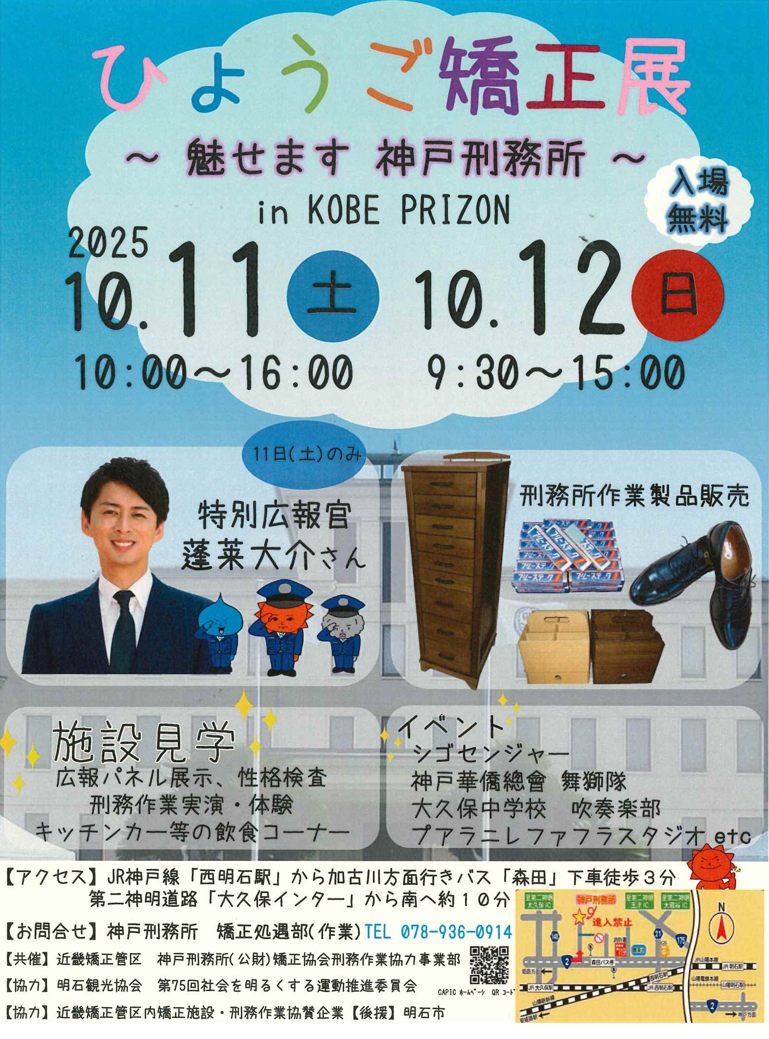神戸刑務所で「ひょうご矯正展」が開催されます。刑務所作業製品の販売が行われるほか、施設見学や刑務作業の実演・体験、音楽ステージなどもあります。11日(土)は天気予報士の蓬莱大介さんが特別広報官として登場します。