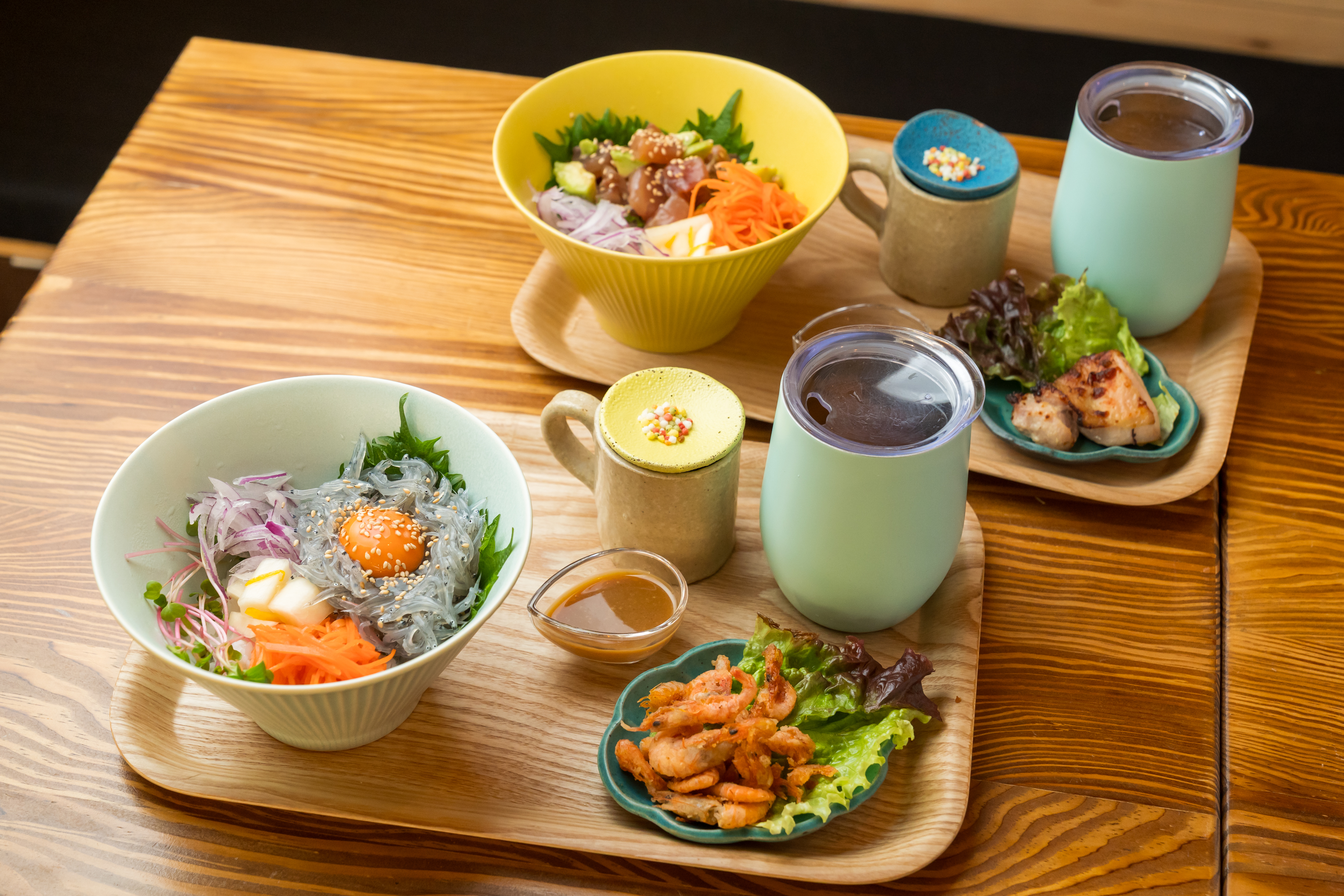 明石の旬の魚と米こうじを使った、野菜たっぷりの健康ランチ。カフェは米粉や豆乳を使った手作りスイーツです。