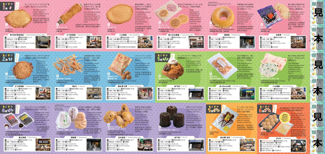 | 販売場所 | あかし案内所 明石市大明石町1-1-23 ピオレ明石西館内 TEL.078-911-2660 営業時間/(平日)9:00〜19:00 (土・日・祝日)9:00〜18:00 明石観光協会事務所 明石市東仲ノ町6-1 アスピア明石北館7階 TEL.078-918-5080 営業時間/8:55〜17:40 ※月曜定休 ※旅行会社のツアー用にまとめてご注文の際は当事務所で承ります。 |